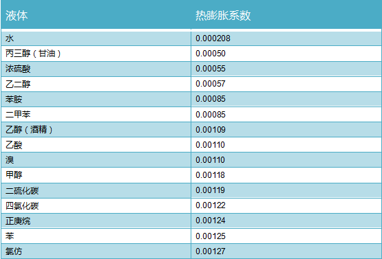 表1.常見液態試劑熱膨脹系數