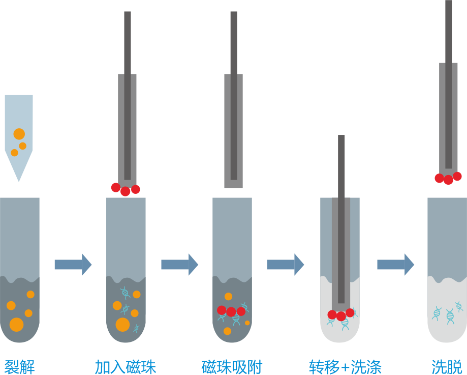 裂解:通常裂解液中會含有洗滌劑,根據樣本的不同還會添加蛋白酶,用于裂解和溶解蛋白質;另外還有高濃度的離液鹽,如異硫氰酸胍,它能擾亂氫鍵,破壞核酸與水之間的結合,使核酸能夠與磁珠結合。