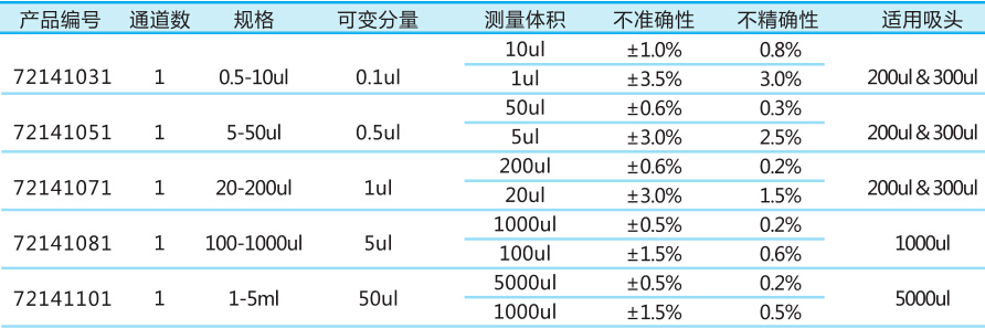 Colour系列單道移液器技術參數:
