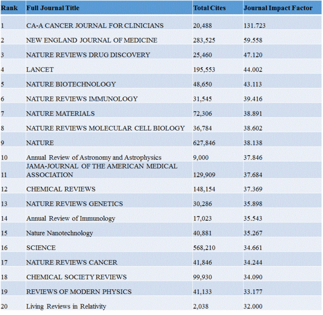 生物類排在第一位的是 NATURE BIOTECHNOLOGY,今年的影響因子是 43.113。醫(yī)學類排在第一位的是 CA-A CANCER JOURNAL FOR CLINICIANS,今年影響因子為 131.723。物理類排在第一位的是 REVIEWS OF MODERN PHYSICS,影響因子為 33.177,化學、納米、材料類排在第一位的是 CHEMICAL REVIEWS,影響因子為 37.369。